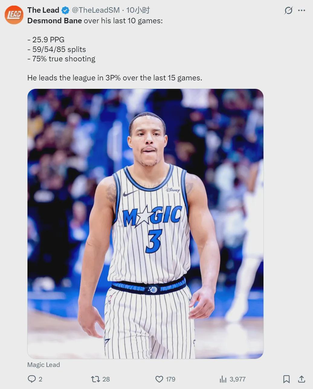 最近10场比赛,魔术后卫贝恩场均能砍下25.9分,投篮命中率59.3%,三分命中率53.7%,罚球命中率84.9%,真实命中率高达75%。过去15场比赛,贝恩的三分命中率领跑全联盟。截至今天赛前,魔术32胜28负暂列东部第七。